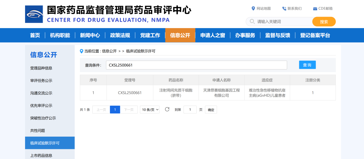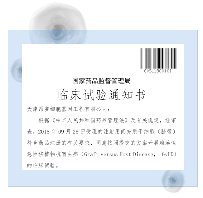 2025年11月3日, 天津昂賽細(xì)胞基因工程有限公司申報(bào)的注射用間充質(zhì)干細(xì)胞(臍帶)治療難治性急性移植物抗宿主病(aGvHD)兒童患者的適應(yīng)癥獲得國家藥品監(jiān)督管理局臨床試驗(yàn)?zāi)驹S可